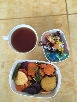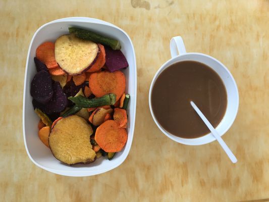 Ingrediente | cenoura, quiabo, cogumelo, microplaqueta de batata doce, rabish roxo, óleo de palma, sal |